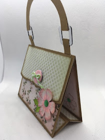 I love how this card stands and presents.  So for the metal looking links in the handle strap I cut 3 for each side out of  black cardstock and adhered together then I cut some out of  silver paper to give the silver metal look and adhered.  I cut the handle/strap twice also and adhered together.  I feel like these extra steps really helped to keep the handle standing tall, which I love.